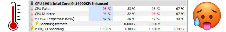 Hingefahren. Diagnose. Intel i9-14900KF auf 96 Grad Celsius.